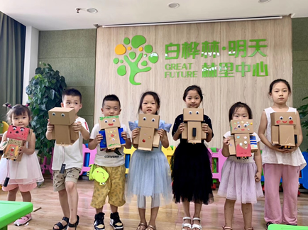 除了学习分类处理垃圾的方法保护环境,变废为宝也是环保的可行路径。现场小朋友们组队协作,动手实践将废旧的纸箱与淘汰的小玩具重装改造,制作成精美可爱的垃圾分类机器人,让这些原本要被丢弃的“垃圾”摇身一变成为环保“变形金刚”。老师对大家的作品进行了一一点评、赞许有加,并挑选出表现优异的团队授予其“环保小卫士”的荣誉证书。