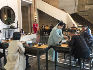 茶艺师将点茶的历史沿革以及其在中国茶道文化中的历史地位为业主款款道来。点茶始于五代,盛行于宋,是古代茶文化的经典之作,深受文人骚客的喜爱与推崇。王国维在《茶汤遣客之俗》中有云:“今世官场,客至设茶而不饭,至主人延客茶,则仆从一声呼送客矣,此风自宋已然,但用汤不用茶耳。”点茶不仅可以品味茶汤,更因为其富有艺术的茶面点缀而具有观赏价值。业主们仔细聆听关于点茶的趣闻轶事,深入了解了点茶文化的起源于传承。