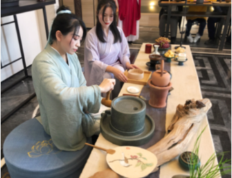 在老师的指导下,业主们虔心学习了点茶技法。本次茶叶选用凤凰单丛茶,该茶叶紫薇浓醇鲜爽,润喉回甘,清澈明亮的汤色适合泡制茶汤。首先将块状茶饼锤压碾碎,随后将研磨精细的茶末放入茶盏。将汤瓶中的清水煮沸后缓缓注入茶盏中,用竹制的茶筅不断搅拌、击拂直至茶汤表面形成浓厚的白色沫花即可,古人称其为“战雪涛”。在清脆悦耳的古筝伴奏声中,业主们潜心贯注的制作点茶,感受清香茶汤,畅聊快意人生。