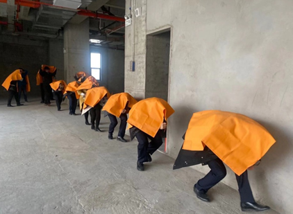 活动现场,工程管理部安全负责人从高楼逃生要领和扑救火情的注意事项几个方面进行详细阐述,随后进行火灾消防演练。现场,随着模拟火灾烟雾的扩散,员工们迅速反应,披上消防毯,用湿毛巾捂住口鼻,按照疏散路线冷静紧张而有序地撤离“事故现场”。通过实操将理论与实践相结合,员工的消防技能和处置火灾的能力大大提升,逃生技能也得到了进一步的提高。